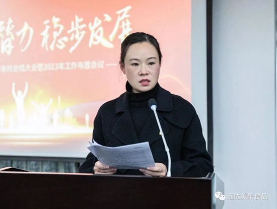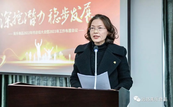 最后,集团张董事长做了重要讲话,对美乐公司2022年取得的成绩给予肯定,同时,董事长也对美乐公司的经营发展工作提出希望和要求:美乐公司作为远达集团旗下的实体产业,是富顺的一张名片,借助远达美乐女篮的明星效应,在品牌宣传和市场拓展方面进行整体包装策划,提升美乐品牌形象;新的一年,全体远达美乐人要恪守“先做人 后做事”的理念,对照年度目标,改革创新,积极应对市场、环境变化,抓住一切有利时机,全力推进各项工作落实、落地,高质量完成全年目标任务;远达集团的发展得益于党的好政策,全体远达人要紧跟党的步伐,不忘初心,继续前行,积极履行社会责任,为员工谋福利,为地方经济做贡献,在实现共同富裕的道路上续写新篇章。